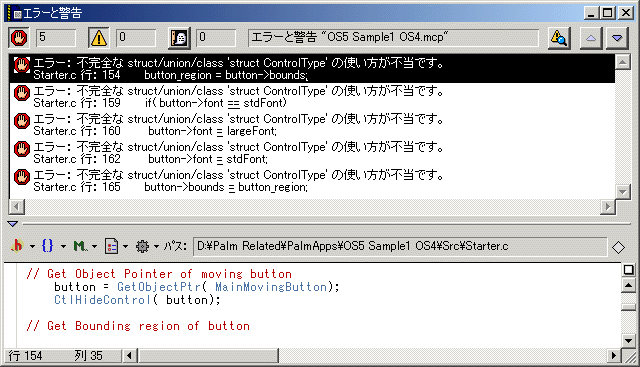 まずこのソースコードをPalm OS 5 SDKでコンパイルしてみます。図1のようにエラーが出てきます。