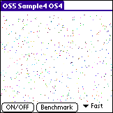 今回のサンプルは、図1 にあるように画面内で色が異なるドットが点滅しながら移動していくものです。シューティングゲームにおける星をイメージしたものです。ON/OFFボタンを押すと画面描画のON/OFFが切り替わります。